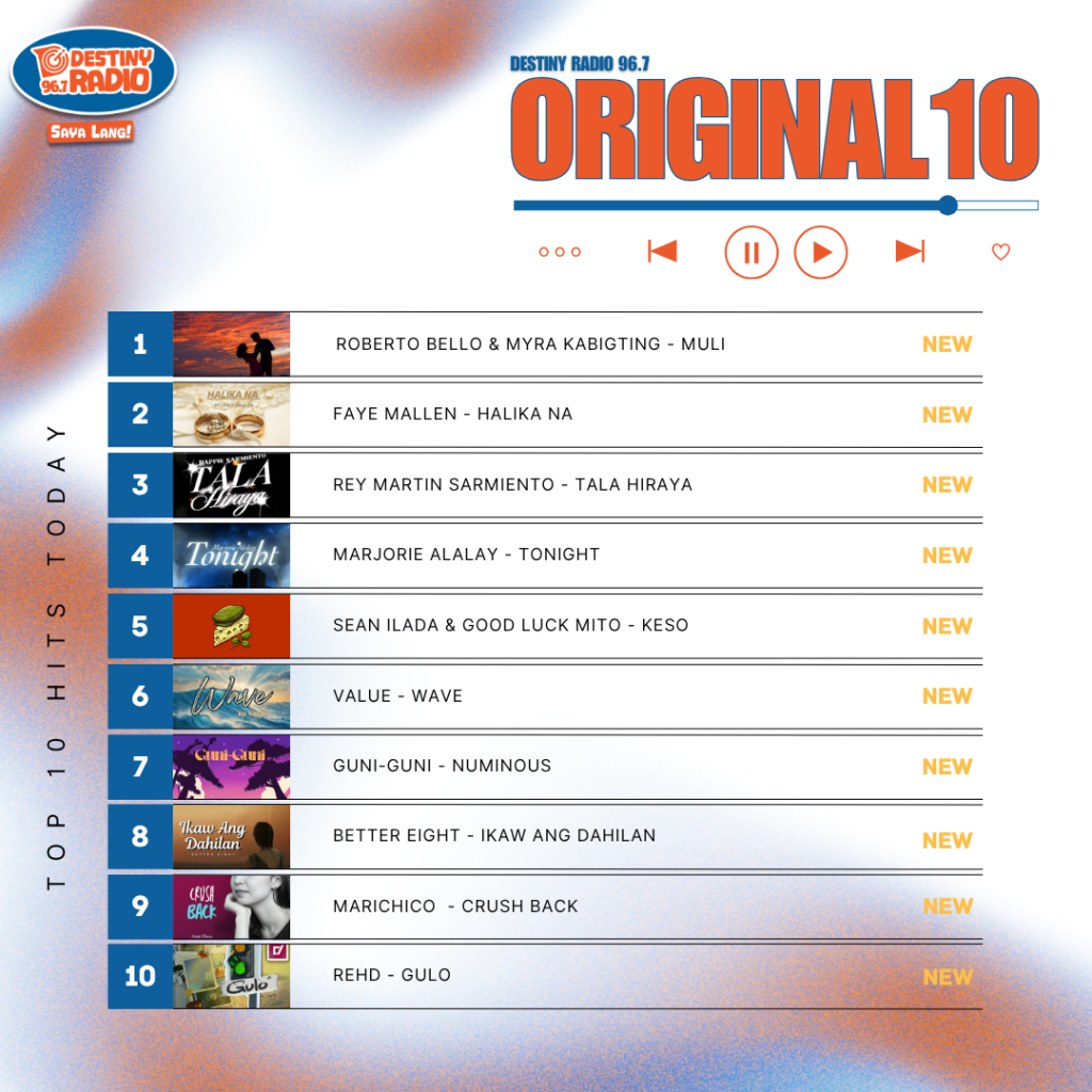 Hi mga ka-Destiny! Narito na ang daily ranking ng inyong mga paboritong OPM artist as of July 9, 2025 sa 96.7 Destiny Radio!